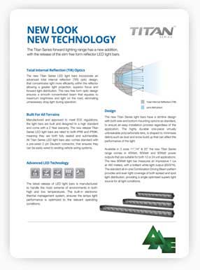 The new Titan series free form total internal reflection LED light bars that set a new standard with advanced technology, innovation and design. Manufactured with total internal reflection (TIR) allows for an enhanced concentration of light, maximising forward light while minimising light scatter. Advanced temperature management technology ensures the light performs with optimal light output in the most extreme conditions. Designed to IP68 and IP69K meaning a fully sealed and submersible light ensuring the new Titan Series LED light bar is built for all terrains. The highly durable one-piece polycarbonate lens is shaped to help minimise debris such as dust and snow that can affect the performance of the light. Available in 11”, 14”, 20” length with an output of up to 90Watt that measures 1 lux at 480 meters.